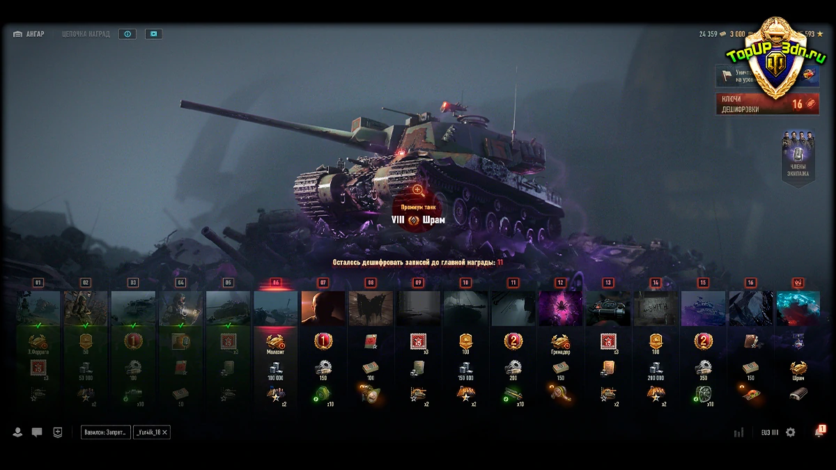 Выполняй боевые задачи и получай ключи дешифровки. С их помощью можно расшифровать записи, которые откроют путь к главной награде. Каждая расшифрованная запись приближает тебя к премиум-танку «Шрам».
