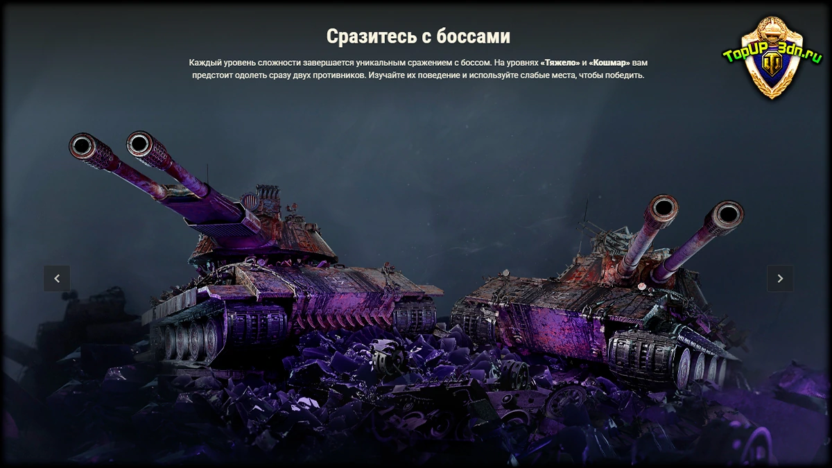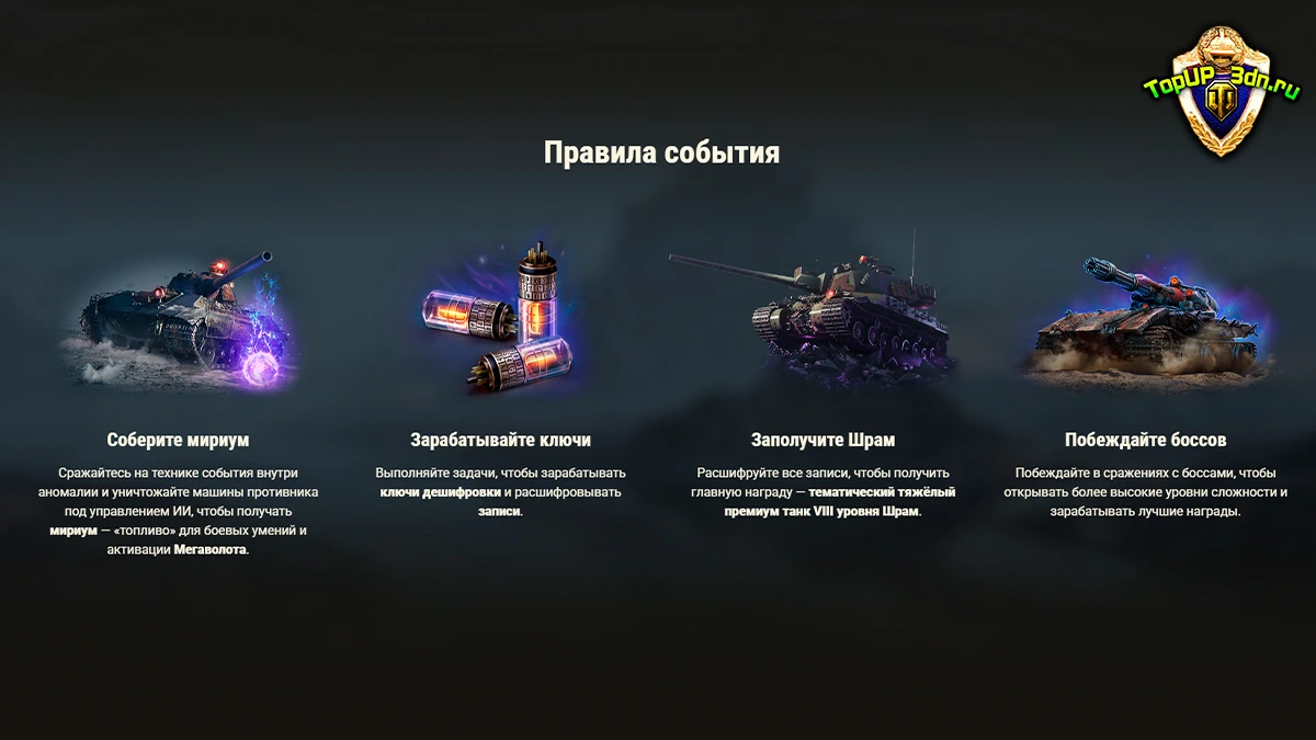 Аномалия ждёт. Собери мириум, расшифруй все записи, победи боссов и заполучи главный приз — премиум-танк VIII уровня «Шрам». Тот, кто выживет в Запретной зоне, заслуживает уважения... и «Шрама» в своём ангаре.