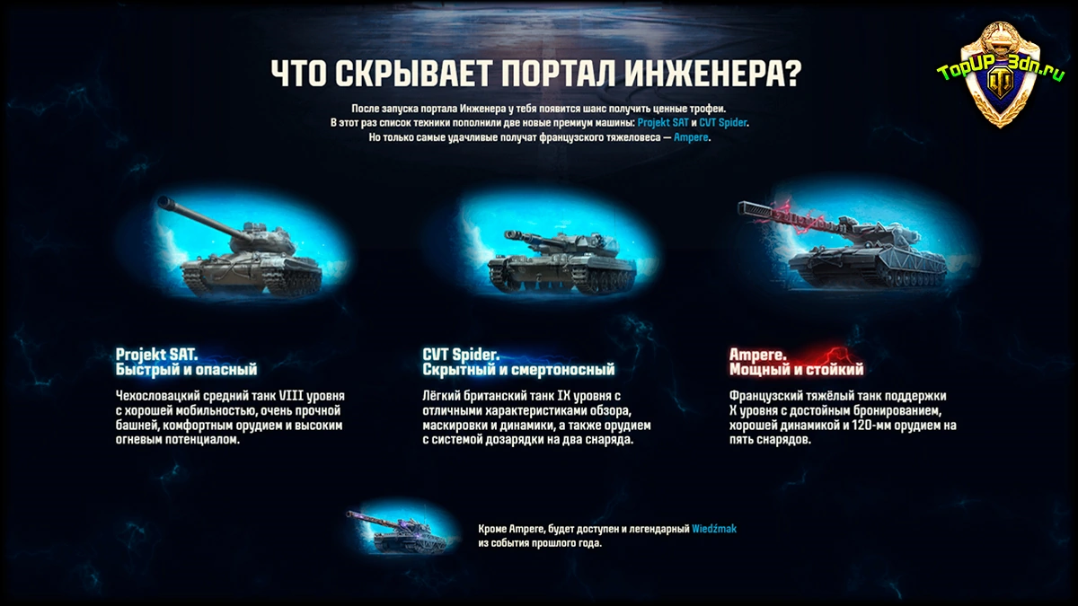 - Wiedźmak — возвращение легенды: польский тяжёлый штурмовой танк X уровня, доступный из прошлого запуска «Ваффентрагера». Вооружён пушкой 130 mm armata Wz. 46, наносящей 560 урона за выстрел.